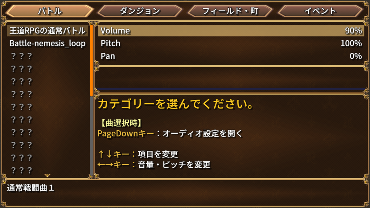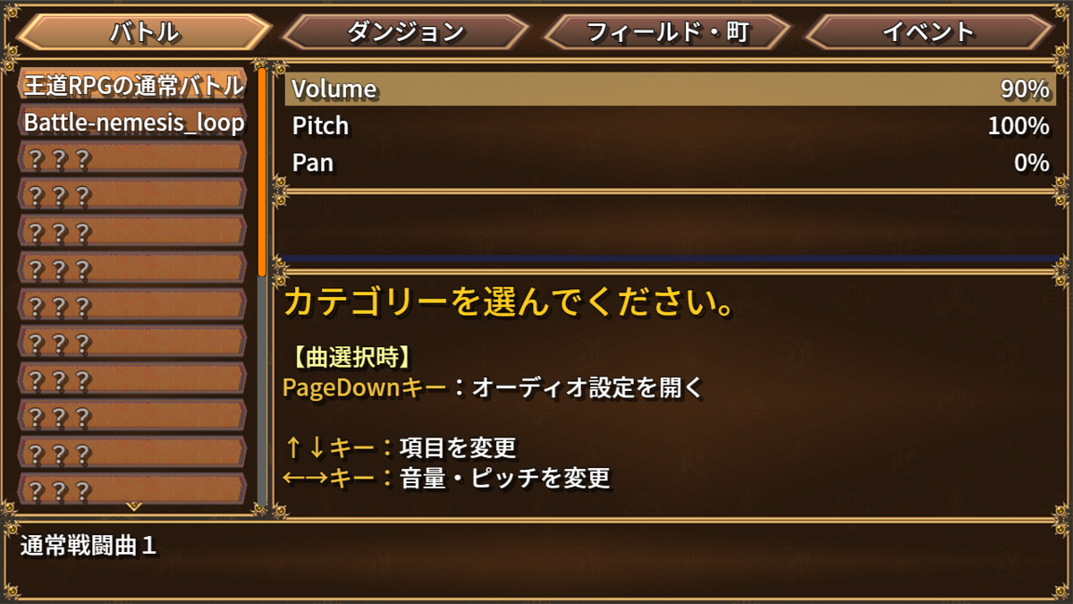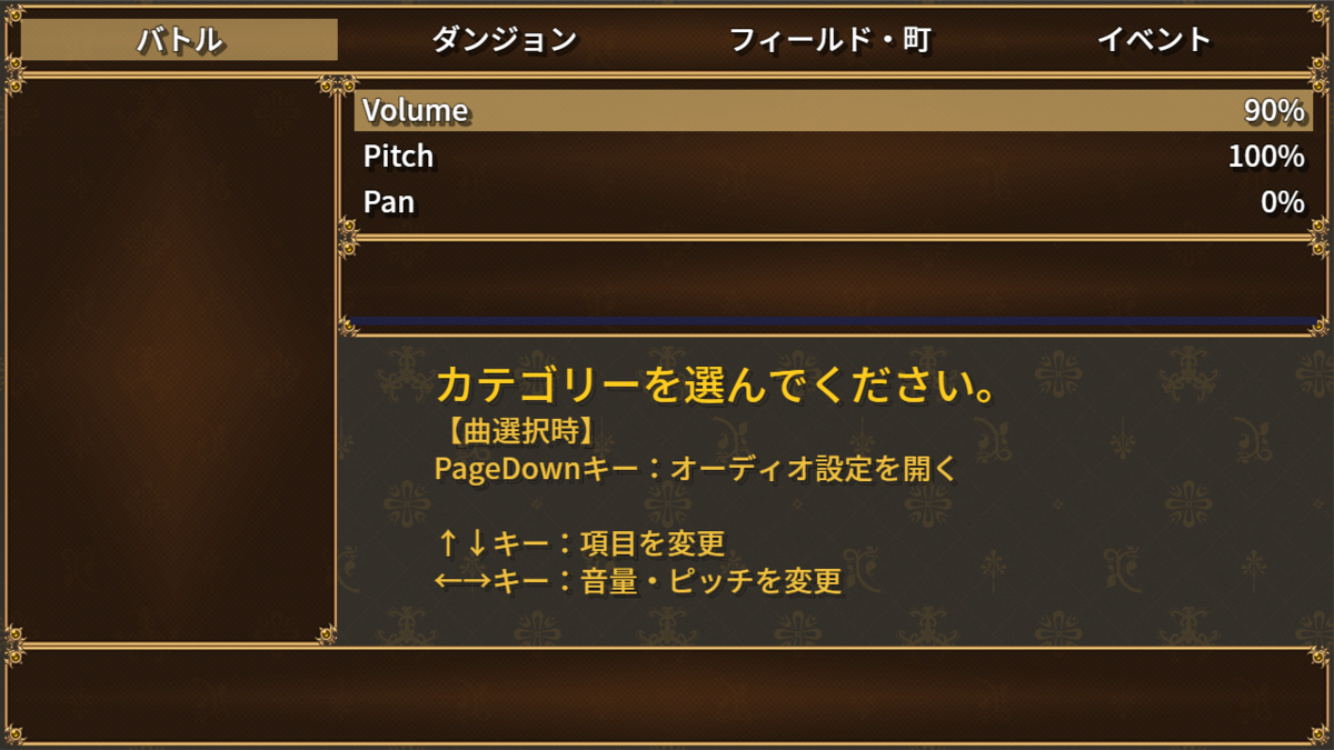 テキストはトリアコンタンさんの ExtraWindow を使って表示しています。 カテゴリ選択やキー操作の説明を画面内に明示することで、 何ができる画面なのかが、ひと目で分かるようになります。 一方で、情報量が増えたことで、画面全体がやや散らかって見える点が気になりました。 ただExtraWindowの枠を削ってるので、枠がないのでさみしいですね。